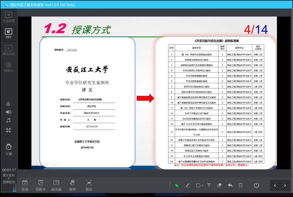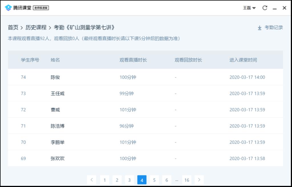 课堂出勤是实现线上线下“实质等效”教学的前提。比如王磊老师利用腾讯课堂平台精准记录《矿山测量学》教学过程中学生进入、离开课堂的时间和学习时长,并及时向学生公布出勤情况,严格按照教学计划督促、把控学生线上课堂的出勤关。